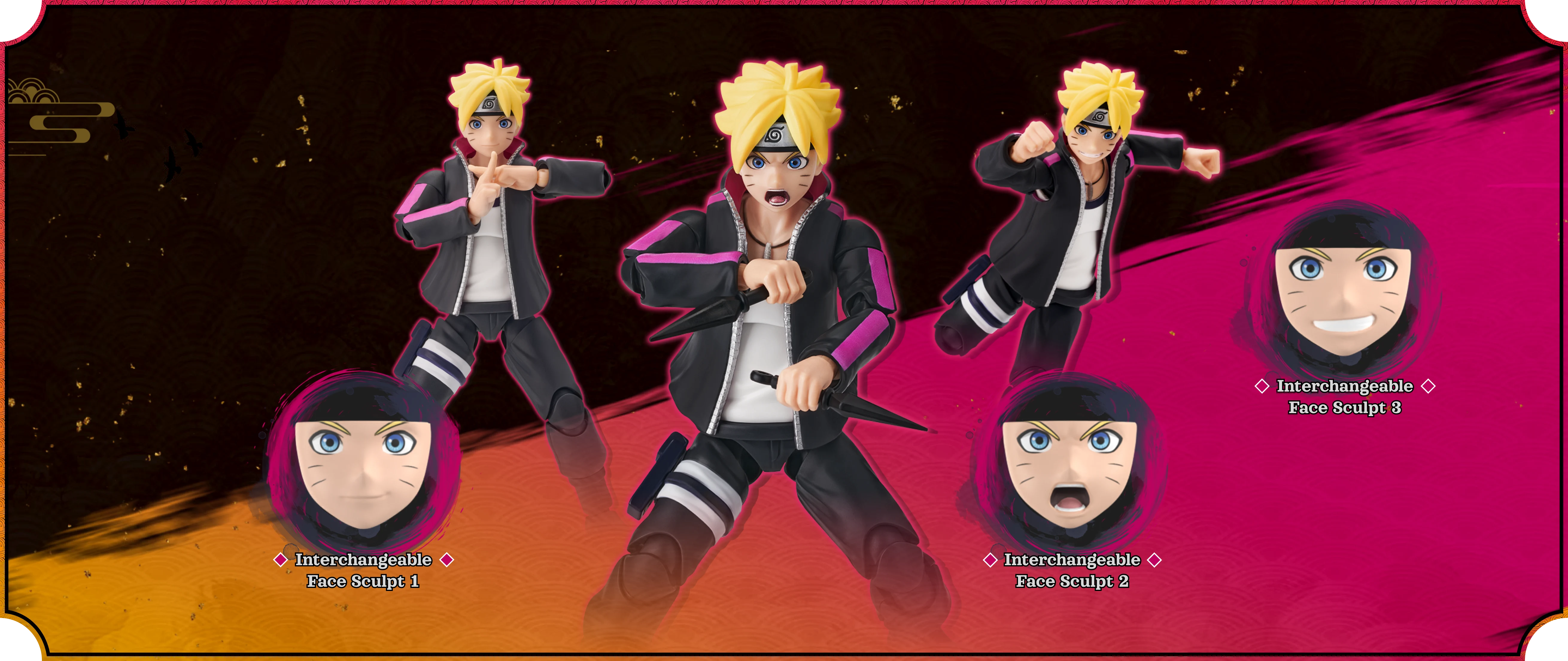 The set includes special effect clouds, a display stand, interchangeable hands, face sculpts, and exclusive weapon accessories, allowing you to freely customize poses and expressions and recreate iconic battle scenes from BORUTO: Naruto Next Generations.