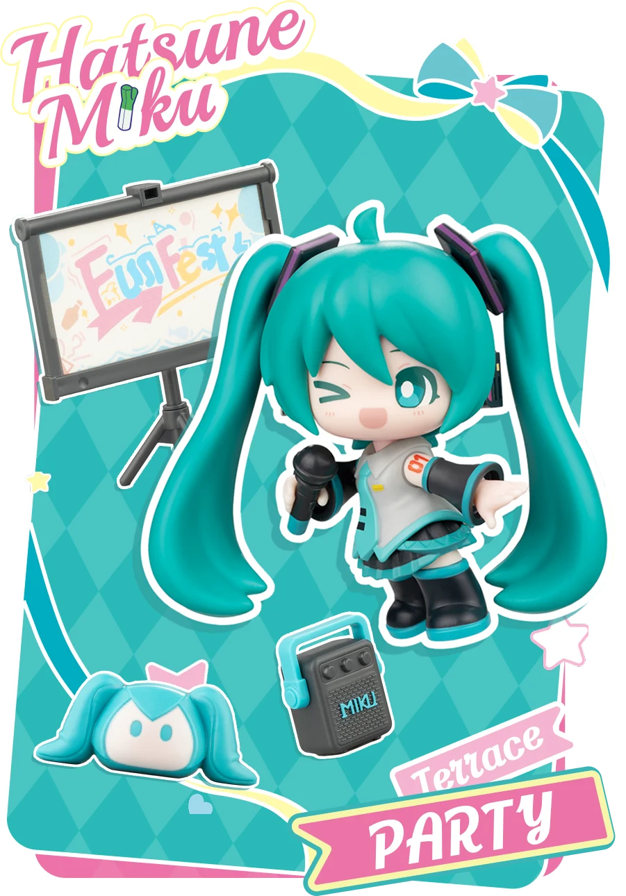 Made from premium PVC, they have a skin-like texture for enhanced playability. The set box contains 6 character toys, with a chance to receive the Chase Version Miku. Perfect for fans aged 14+, create your own magical Terrace Party and enjoy endless fun!