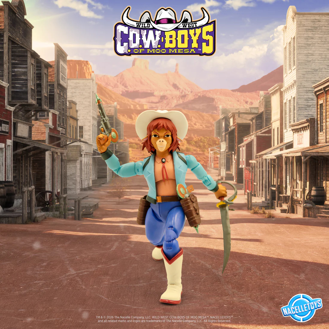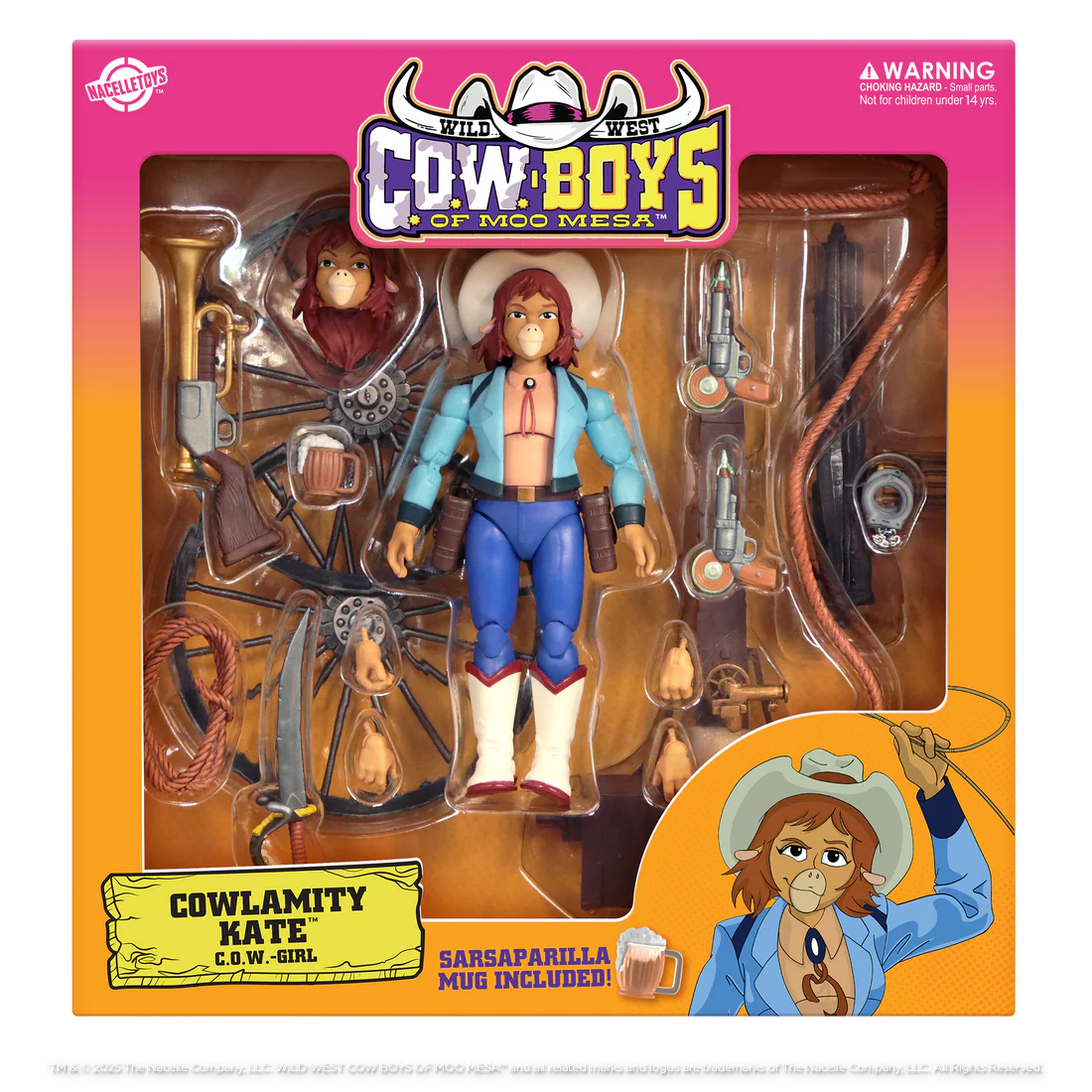 Watch your tail or you might get wrangled by none other than the steer-wrasslin’ rancher herself – Cowlamity Kate! This hard-working C.O.W.-Girl is so skilled with a lasso she could give the Cowlorado Kid a run for his money! When she isn’t herding her cattle, Cowlamity Kate’s days are spent operating the UDDERly profitable Golden Cud Mine. This 7-inch scaled action figure comes fully articulated, with a whole arsenal of tools and weapons (including a gatling gun!) to help the Law Cows beat the rotten outlaws and defend the innocent locals of Moo Mesa!
